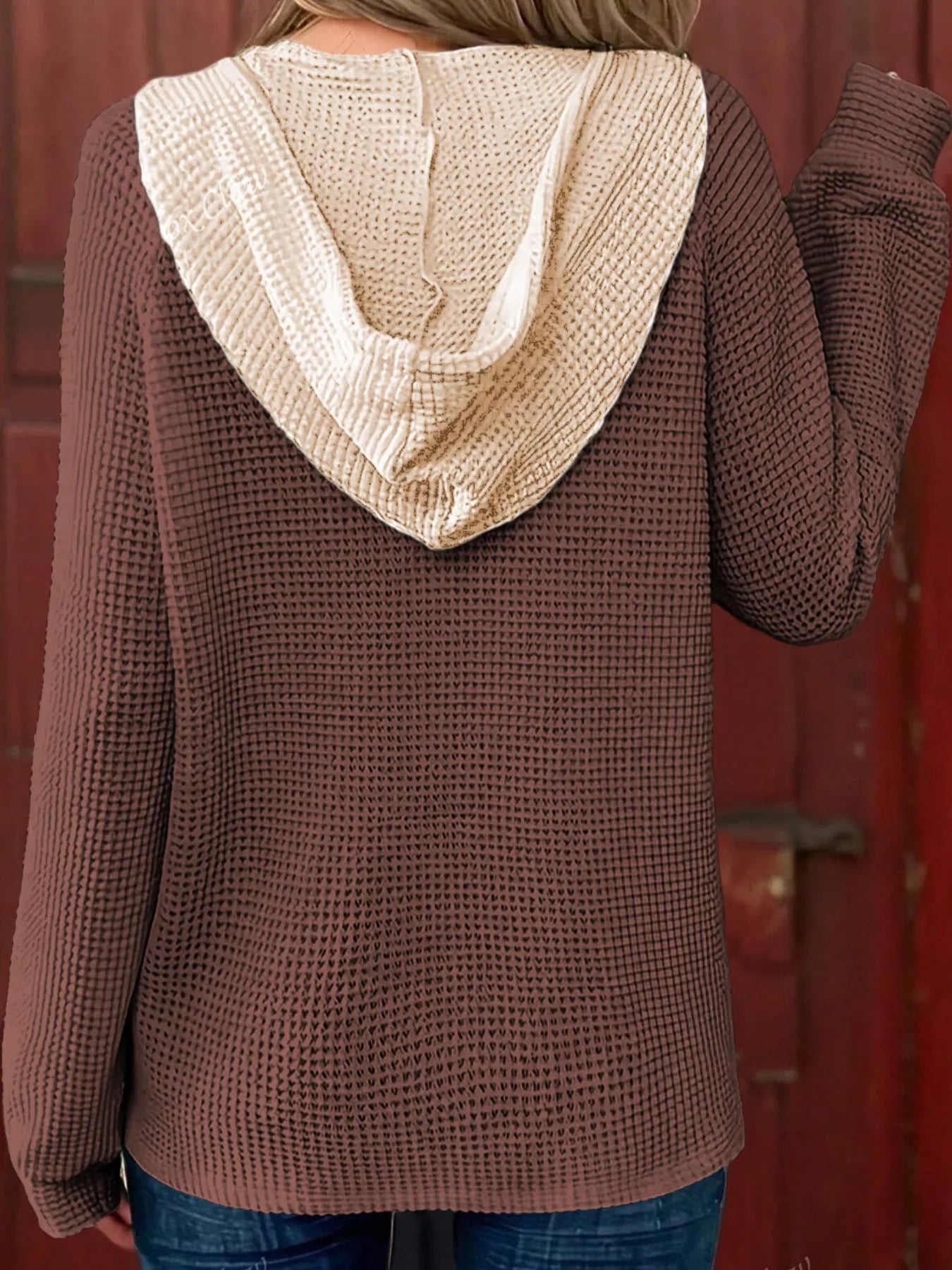 Waffle Contrast Half Buttoned Hooded Pullover Top